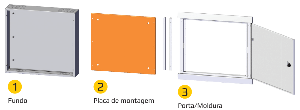- Formado por fundo, placa de montagem pintura laranja, moldura e porta
